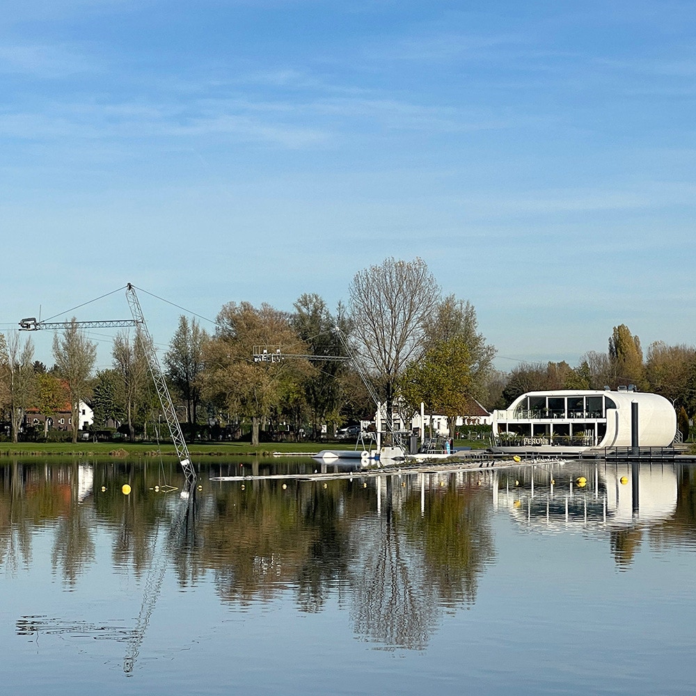 Aan de andere kant van de weg ligt de waterskibaan.