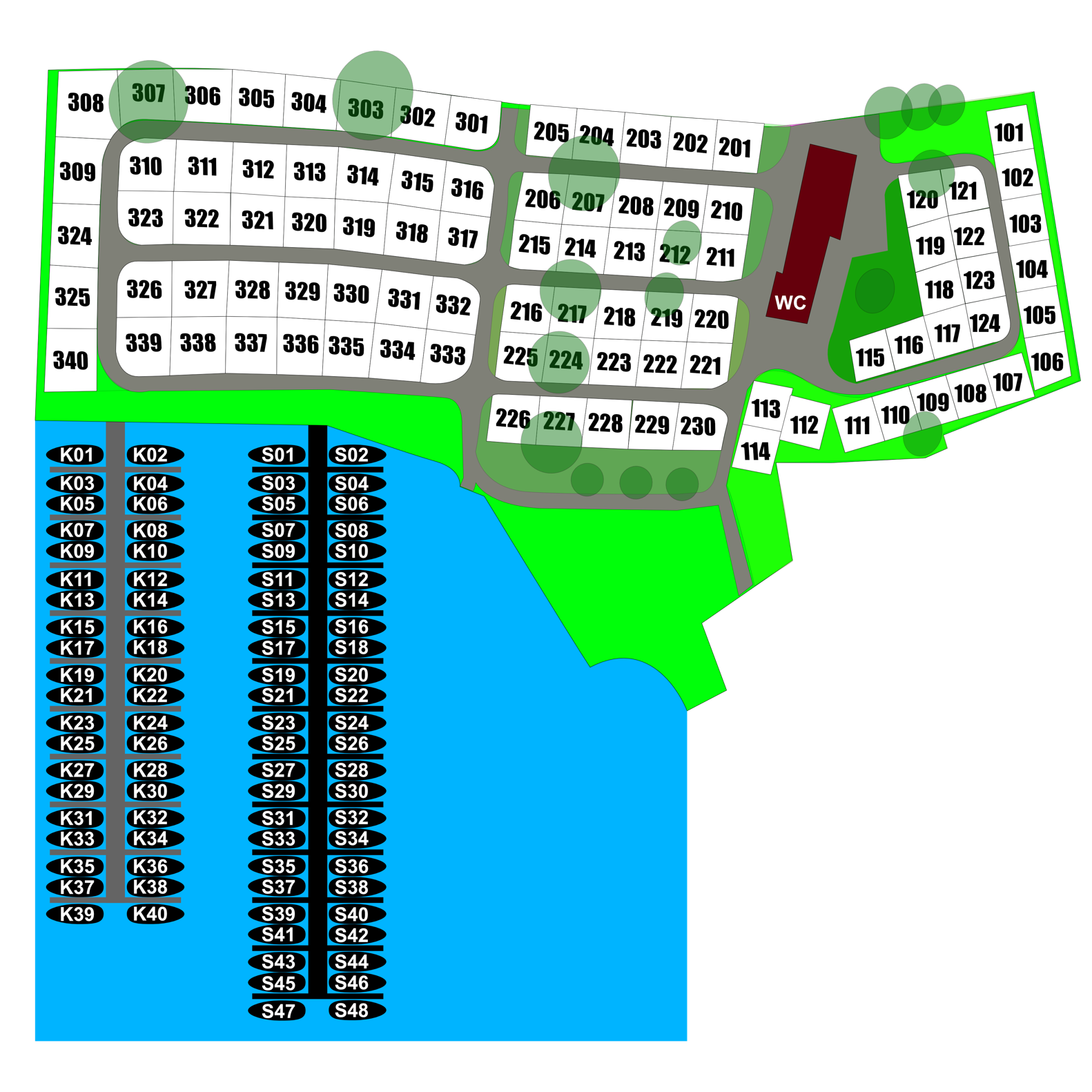 Genummerde campingplaats die voor een geheel seizoen wordt gehuurd.